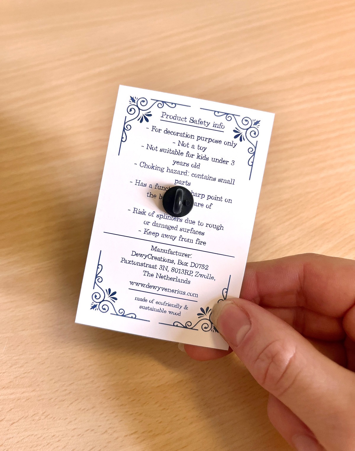 Aan de achterkant zit een metalen pinnetje met een rubberen dopje zodat je hem op allerlei soorten stof kan spelden.