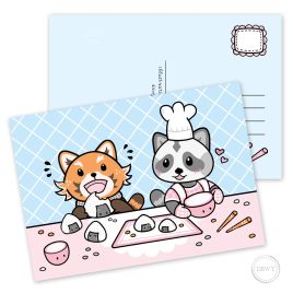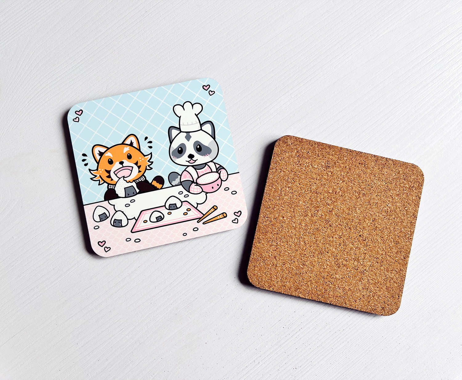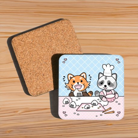 Kawaii onderzetter met rode panda Rowan en wasbeertje Robin. Samen zijn ze lekker sushi aan het eten.