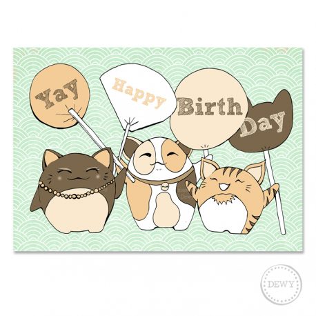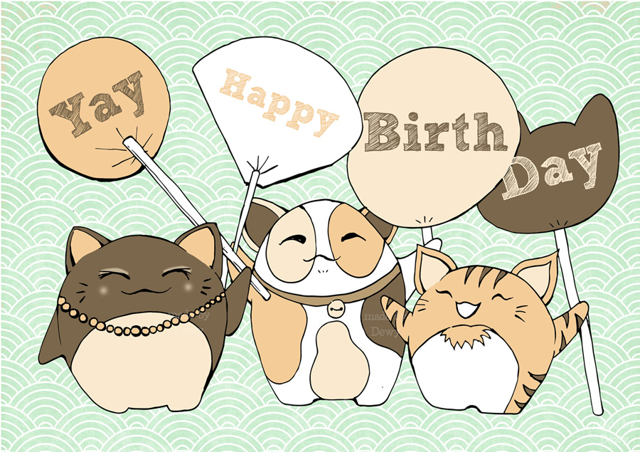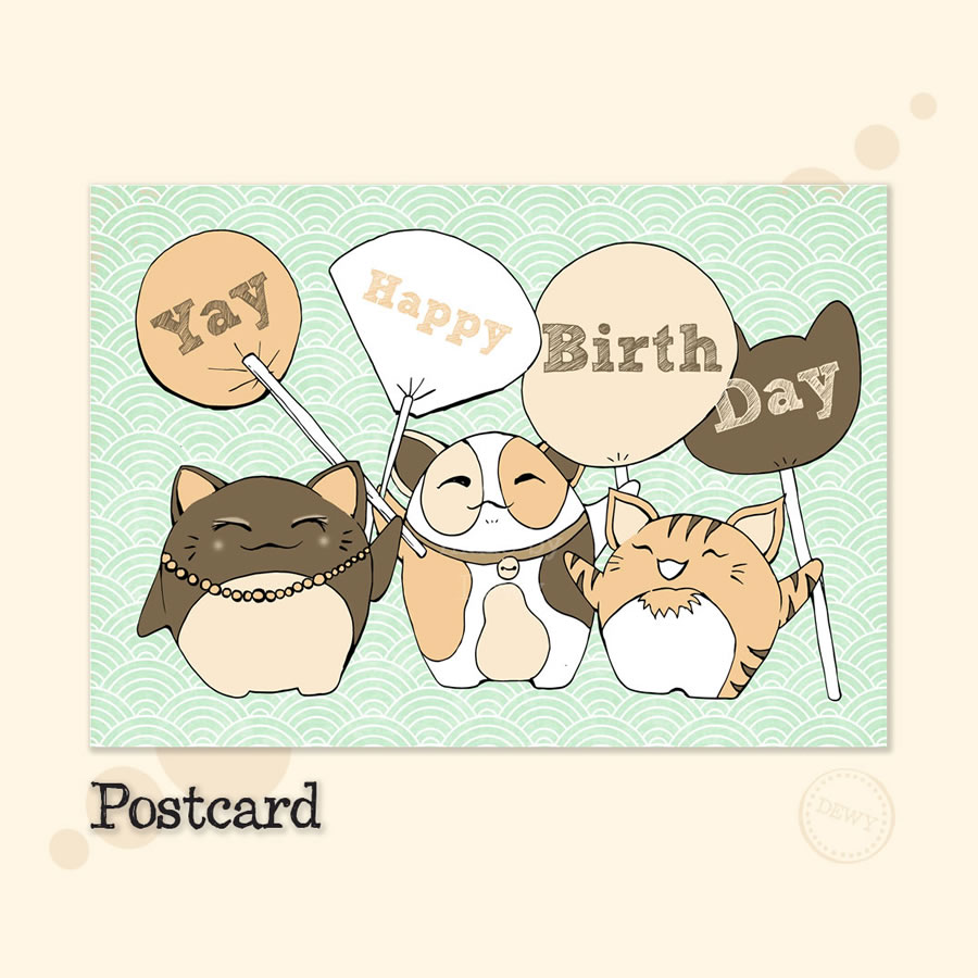 A cute postcard with a group of cute cats. The cats are called "Maneki Neko" in Japanese. Maneki Neko are Lucky Cats which bring fortune and wealth. Who do you want to wish a Happy Birthday?