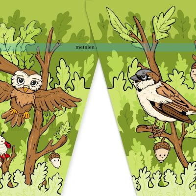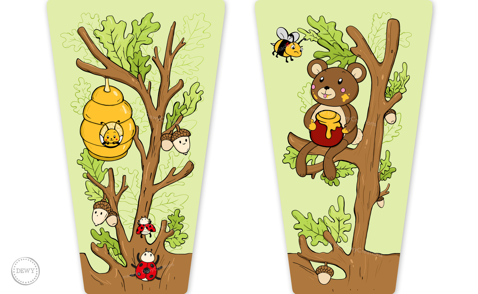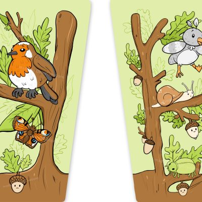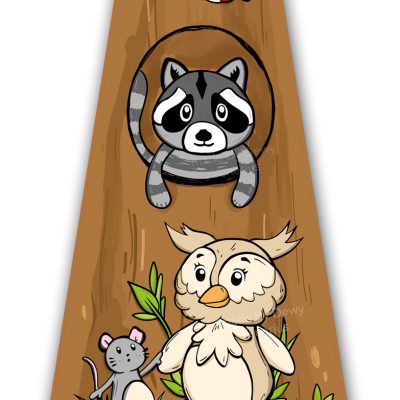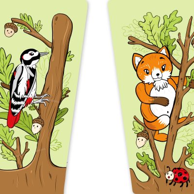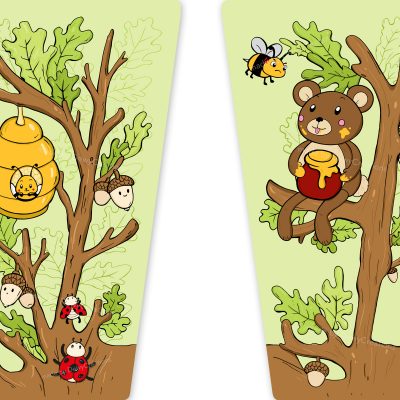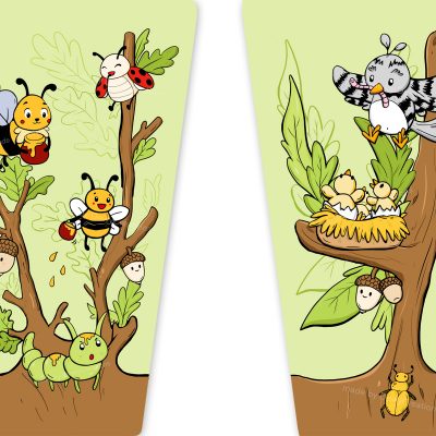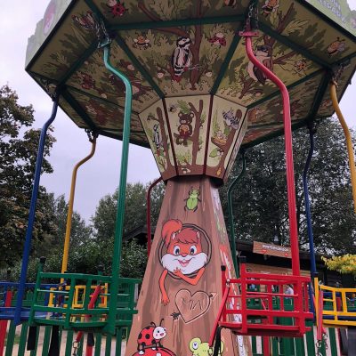 De zweefmolen werd vormgegeven als een grote eikenboom waarin allemaal dieren en insecten schuilen. In het gras kruipen die kleine beestjes zoals insecten en kikkers, bij de stam maken de bosdieren plezier, en in de takken verschuilen zich vogels en andere dieren.