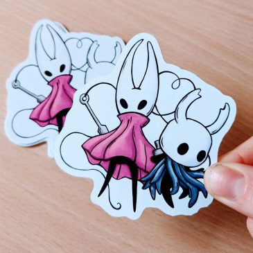 Hornet en Hollow Knight sticker Leuke sticker met Hornet en the Knight uit Hollow Knight. De sticker is geprint op mat papier en heeft een afmeting van ongeveer 78 x 85 mm. De stickers kosten €1,75 per stuk (exclusief verzenden). … Lees verder