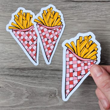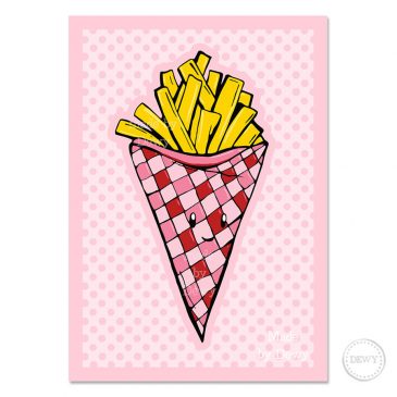 A5 wenskaart met puntzak friet Schattige wenskaart met een vrolijke frietjes, getekend door Dewy. De kaart is onderdeel van de Kawaii Fastfood Collectie. De producten binnen deze lijn hebben tekeningen van allerlei verschillende soorten junkfood, snacks en toetjes die je … Lees verder