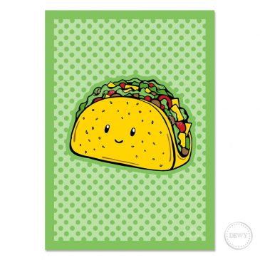 A5 postkaart met vrolijke taco Schattige wenskaart met een vrolijke taco, getekend door Dewy. De kaart is onderdeel van de Kawaii Fastfood Collectie. De producten binnen deze lijn hebben tekeningen van allerlei verschillende soorten junkfood, snacks en toetjes die je … Lees verder
