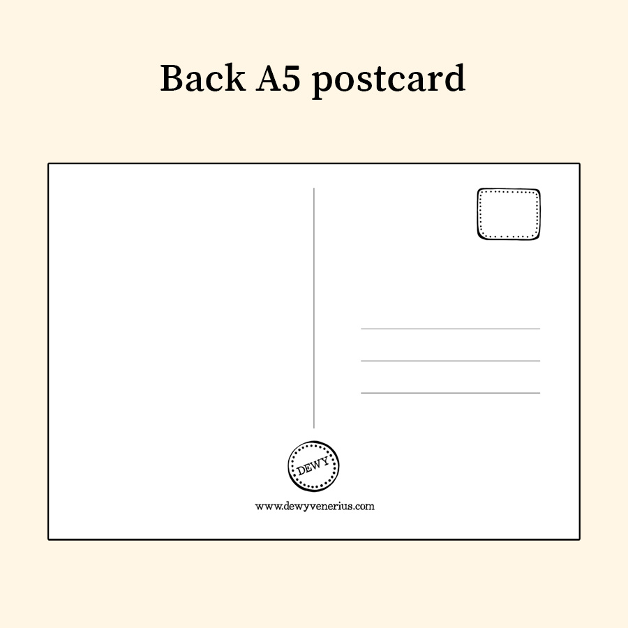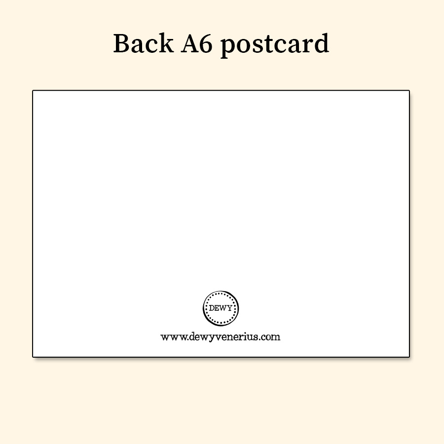 De kaarten zijn gedrukt op A5-formaat (14,9 x 21,0 cm), op semi-glossy papier van 350 gram. Op de achterkant staan voorgedrukte lijntjes zodat je het product makkelijk kan versturen. De prijs is €2,99 per kaart, exclusief verzendkosten. - A6