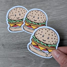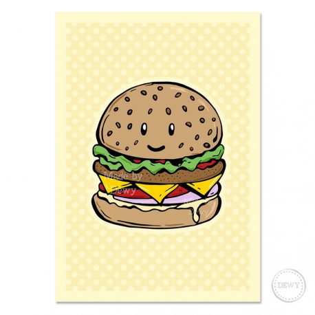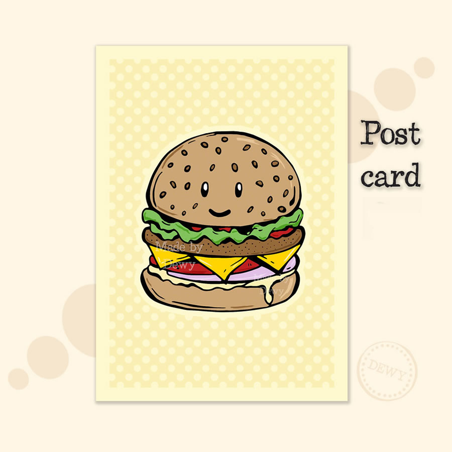Schattige wenskaart met een happy hamburger, getekend door Dewy. De kaart is onderdeel van de Kawaii Fastfood Collectie. De producten binnen deze lijn hebben tekeningen van allerlei verschillende soorten junkfood, snacks en toetjes die je in een snoezige snackbar zou bestellen.